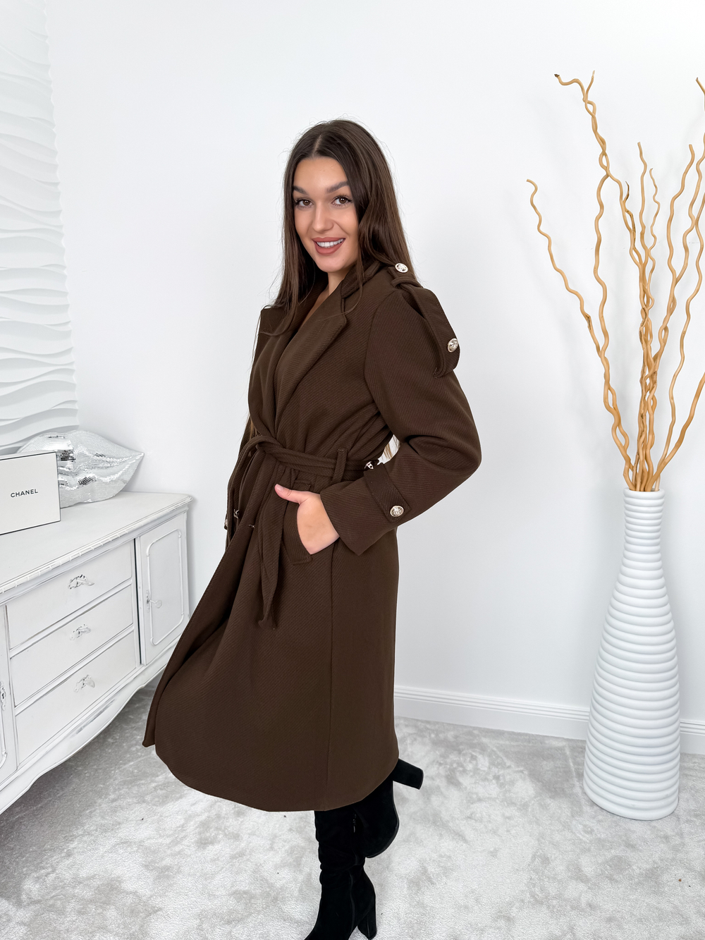 Czekoladowy płaszcz jodełka z paskiem