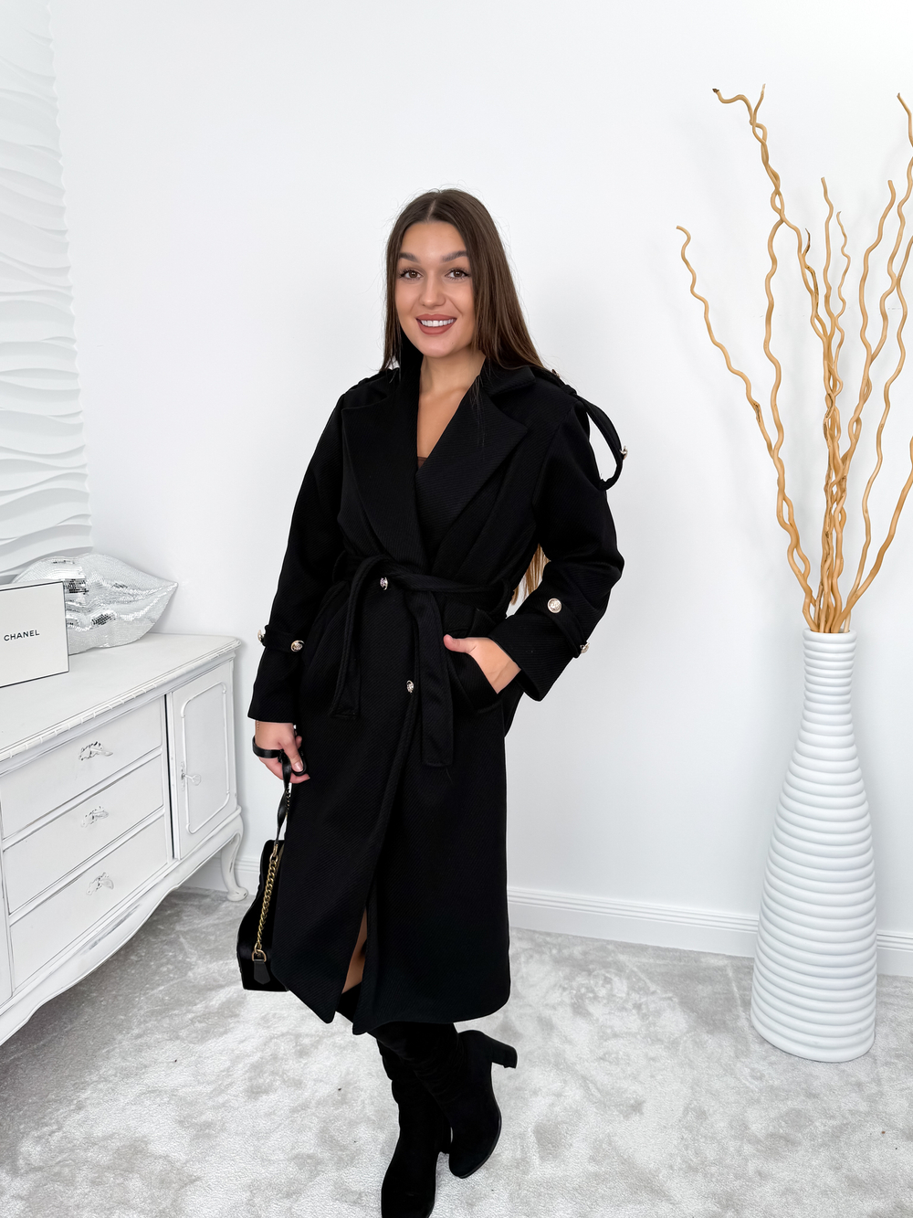 Piękny płaszcz z eleganckiego materiału w jodełkę ma złote guziki i wiązany pasek podkreślający talię. Posiada podszewkę i z tyłu ozdobną naszywkę. Idealny na stylowe, jesienne stylizacje.