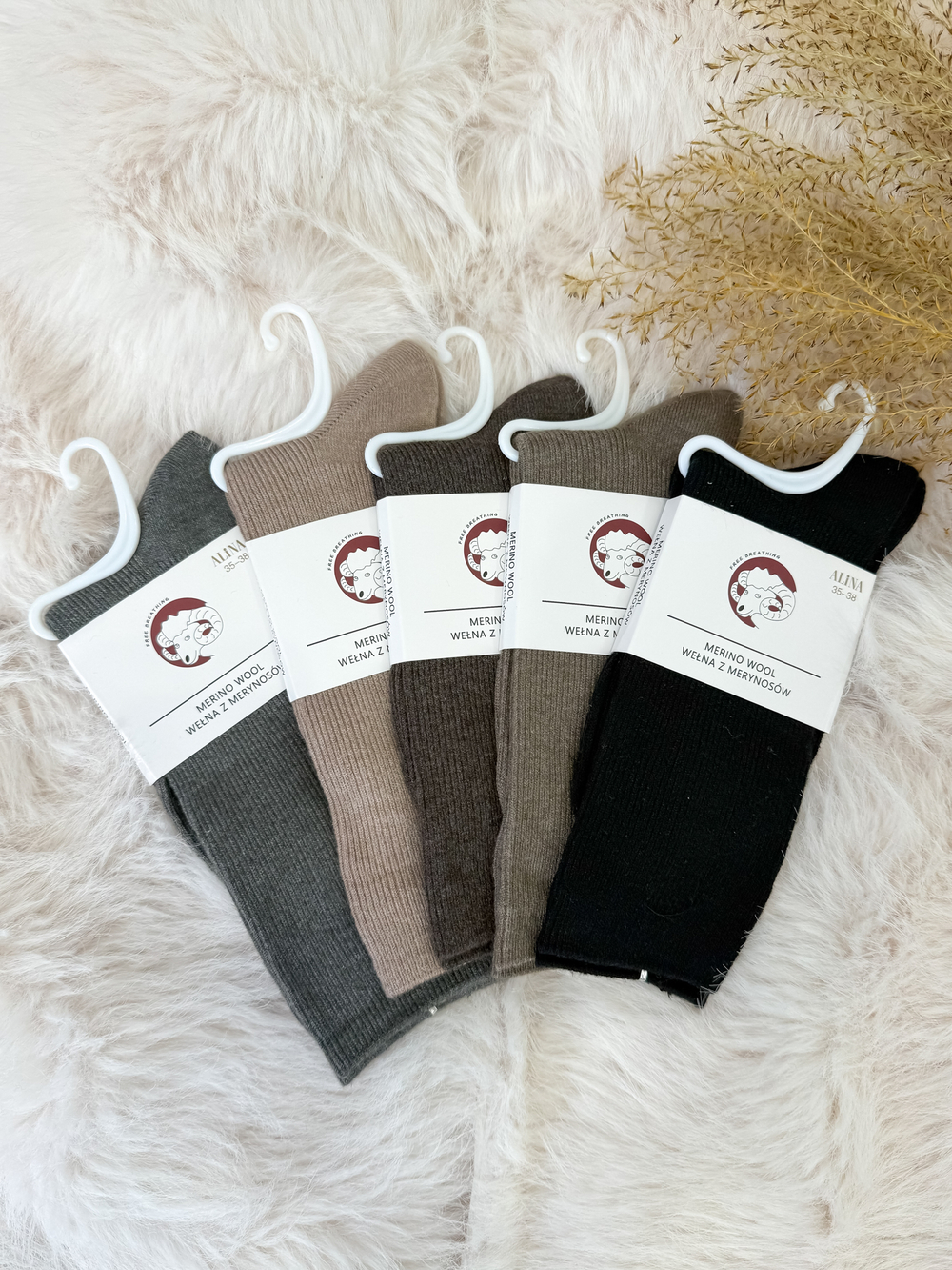 Pięciopak miękkich skarpetek z wełny merynosów w stonowanych kolorach. Delikatny prążek i ciepły, przyjemny w dotyku materiał zapewniają komfort noszenia. Kolory: czekolada, grafit, czarny, fango, ciemny beż.