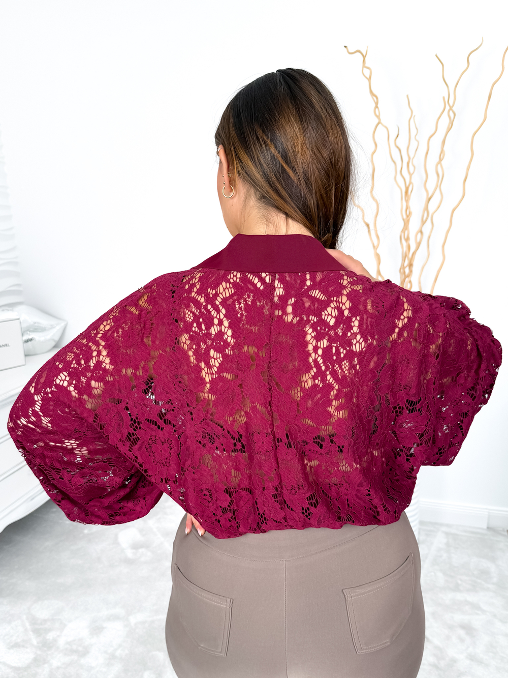 Luźna koszula koronkowa o fasonie nietoperz z szerokimi rękawami zakończonymi gumką. Dół również wykończony elastyczną gumką, co nadaje jej lekkości i wygody. Z przodu posiada podszewkę zapewniającą komfort noszenia.
