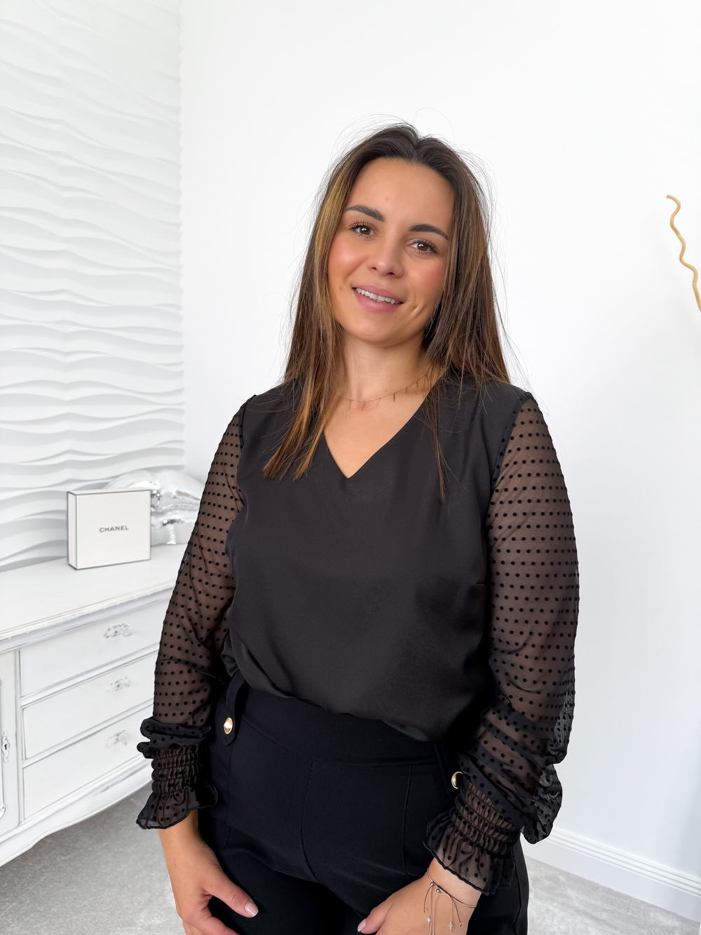 Elegancka bluzka z tiulowymi rękawami w kropki to połączenie klasy i kobiecego uroku. Dekolt w serek subtelnie podkreśla szyję, a długie rękawy zakończone eleganckim ściągaczem dodają stylu. Model dostępny w dwóch modnych kolorach.