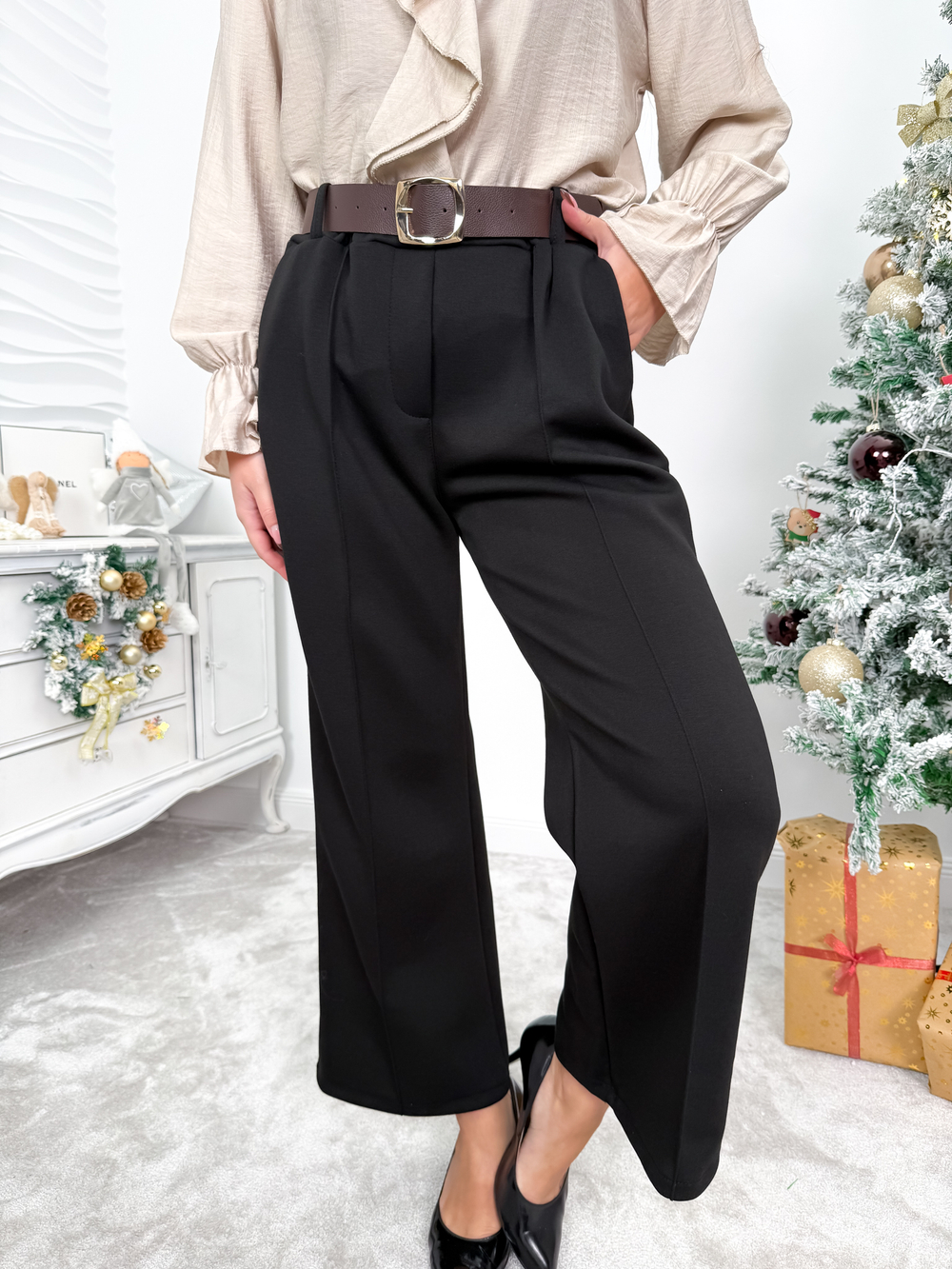 Wygodne spodnie z szeroką nogawką w kant wykonane są z miękkiego, „maślanego” materiału, który doskonale dopasowuje się do sylwetki. Elastyczna tkanina zapewnia komfort noszenia przez cały dzień. W zestawie znajduje się pasek, który podkreśla talię i dopełnia elegancki wygląd.