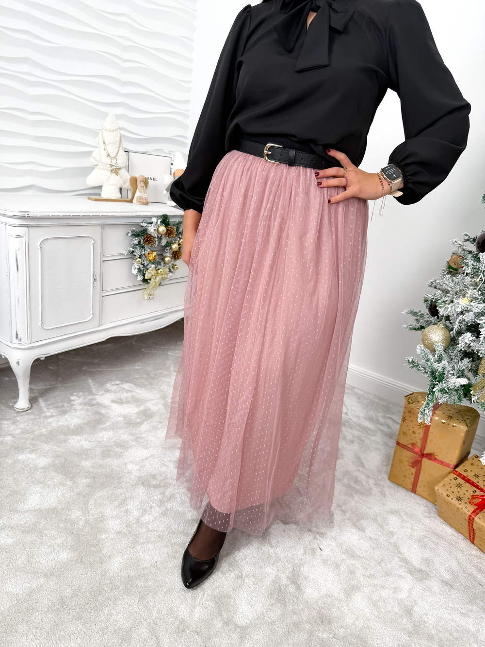 Długa tiulowa spódnica w drobne kropeczki prezentuje się wyjątkowo lekko i kobieco. W talii posiada grubą, elastyczną gumkę, która zapewnia wygodne dopasowanie. Wyposażona w podszewkę, pięknie się układa i nie prześwituje.