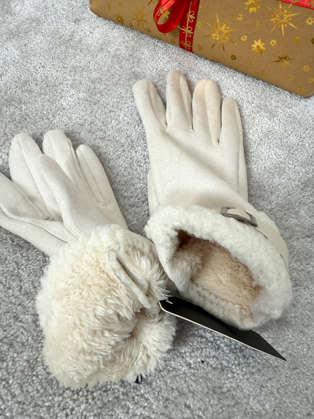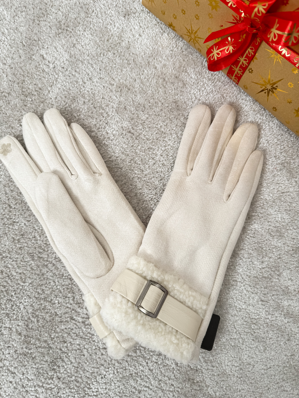 Ocieplane rękawiczki zakończone ozdobnym paskiem wykończonym materiałem typu baranek. Miękkie, ciepłe i przyjemne w dotyku — idealne na chłodne dni. Stylowy dodatek, który łączy komfort z modnym wykończeniem.