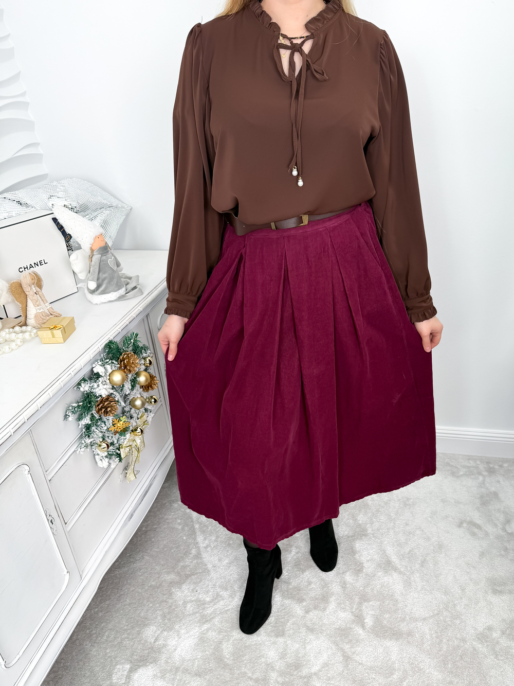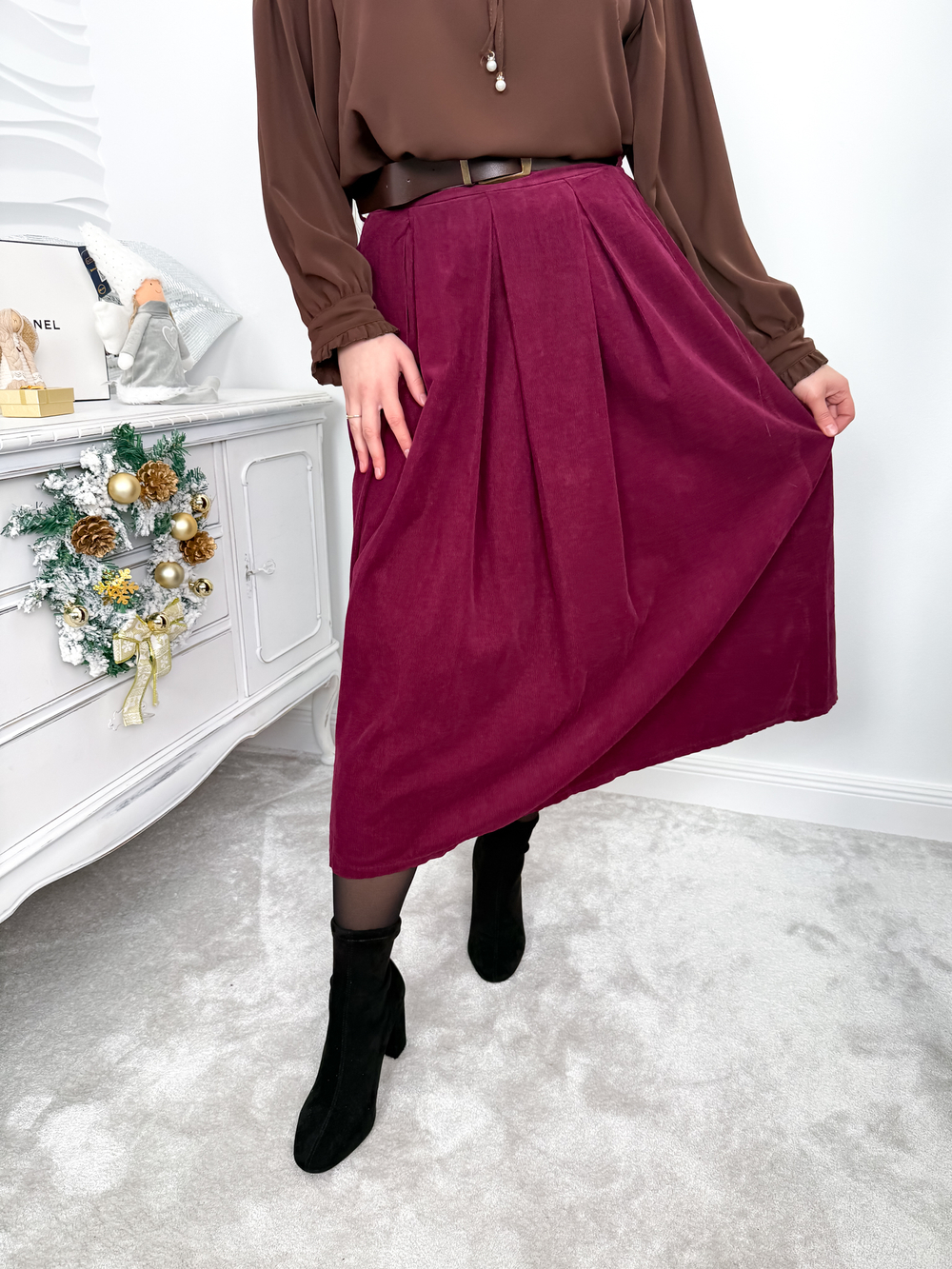 Sztruksowa spódnica midi o rozkloszowanym fasonie to połączenie stylu i komfortu. Wykonana z miękkiego, sztruksowego materiału, doskonale sprawdzi się w jesiennych stylizacjach. Wyposażona w praktyczne kieszenie i dopasowany pasek w zestawie, pięknie podkreśla talię. Elastyczna gumka z tyłu pasa gwarantuje wygodę noszenia i idealne dopasowanie. Uniwersalny design sprawia, że spódnica świetnie komponuje się zarówno z casualowymi, jak i bardziej eleganckimi elementami garderoby.