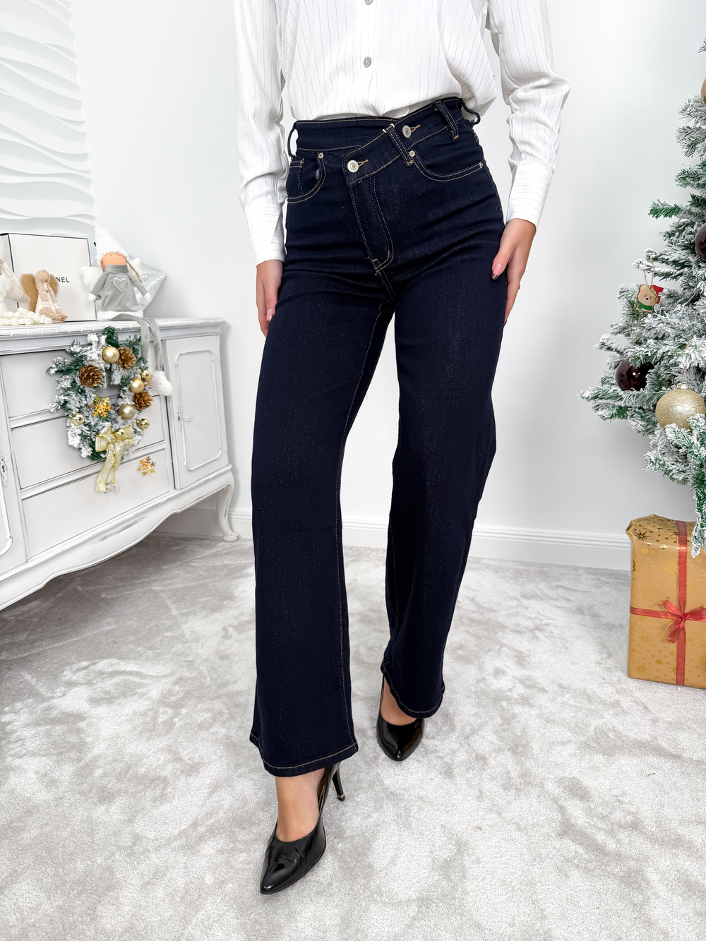 Granatowe jeansy dzwony z szeroką nogawką to modna propozycja w stylu retro. Asymetryczne zapięcie nadaje im oryginalnego charakteru i wyróżnia je na tle klasycznych modeli. Stylowy, ponadczasowy kolor sprawia, że świetnie pasują do wielu stylizacji.