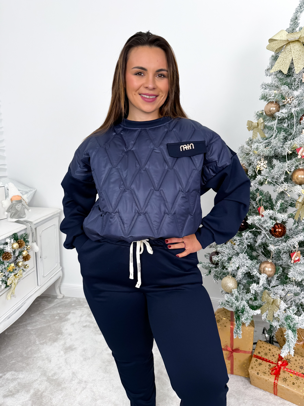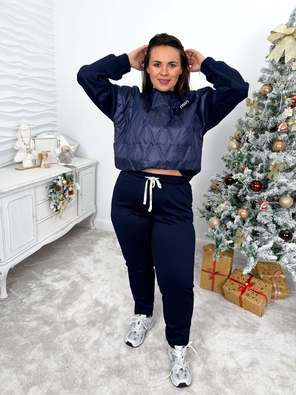 Elegancki komplet dresowy łączy w sobie wygodę z kobiecym, stylowym akcentem. Bluza z efektownym tłoczeniem z przodu, imitacją kieszeni oraz złotą broszką z cyrkoniami przyciąga uwagę i nadaje całości wyjątkowego charakteru, natomiast spodnie z elastycznym ściągaczem w talii, kieszeniami i prostą nogawką gwarantują komfort noszenia. Szeroka gama kolorystyczna pozwala dopasować komplet do różnych stylizacji i okazji.