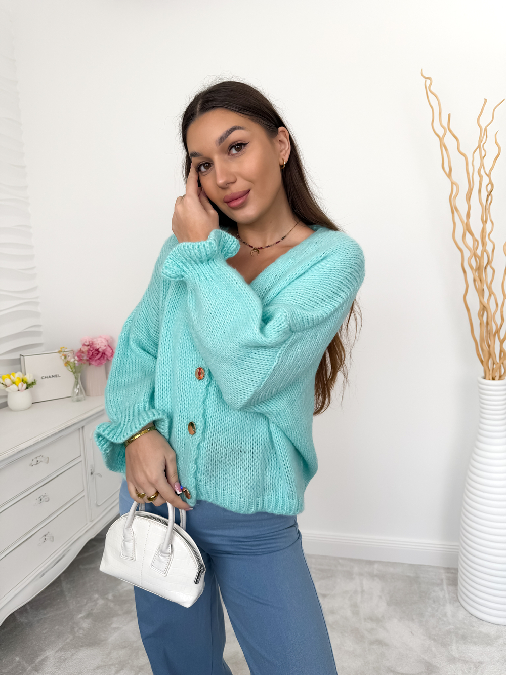 Turkusowy kardigan moher i wełna z falbaną na rękawie