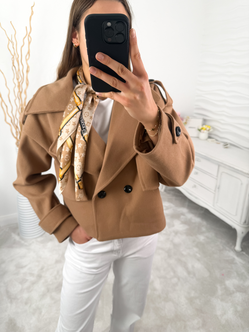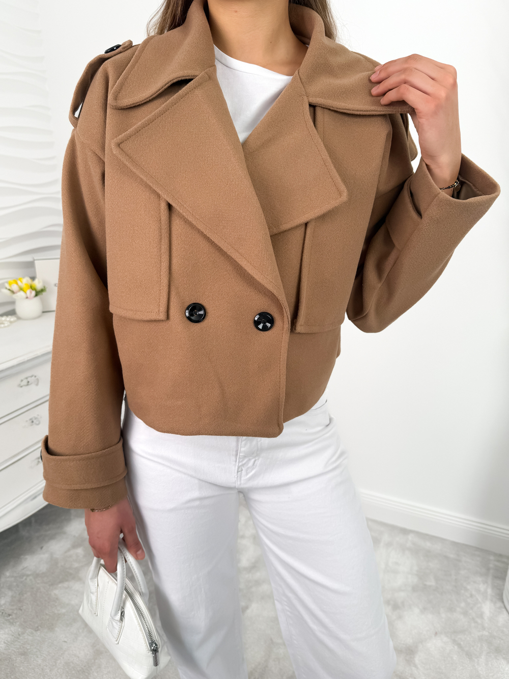 Krótka kurtka z podszewką wyróżnia się eleganckim fasonem i starannym wykończeniem. Ozdobne klapy z przodu oraz pagony na ramionach dodają jej stylowego, klasycznego charakteru. Idealna propozycja do codziennych i bardziej eleganckich stylizacji.