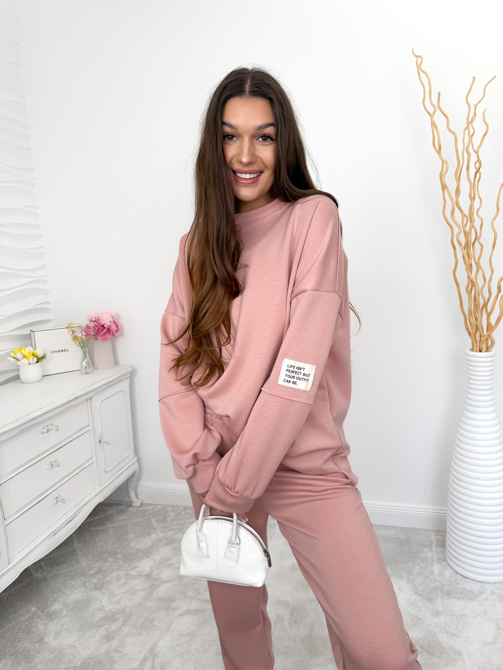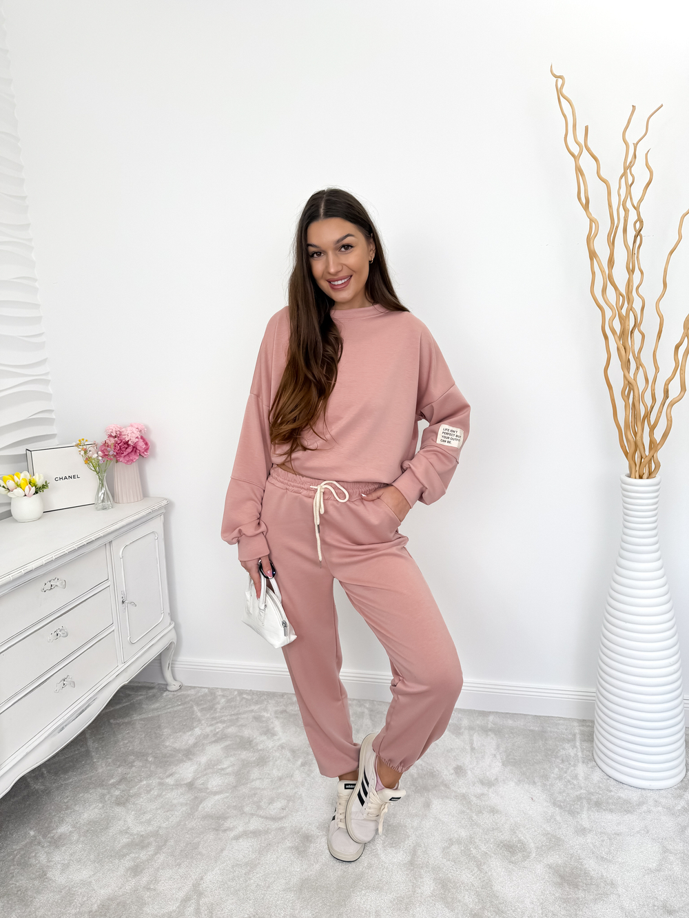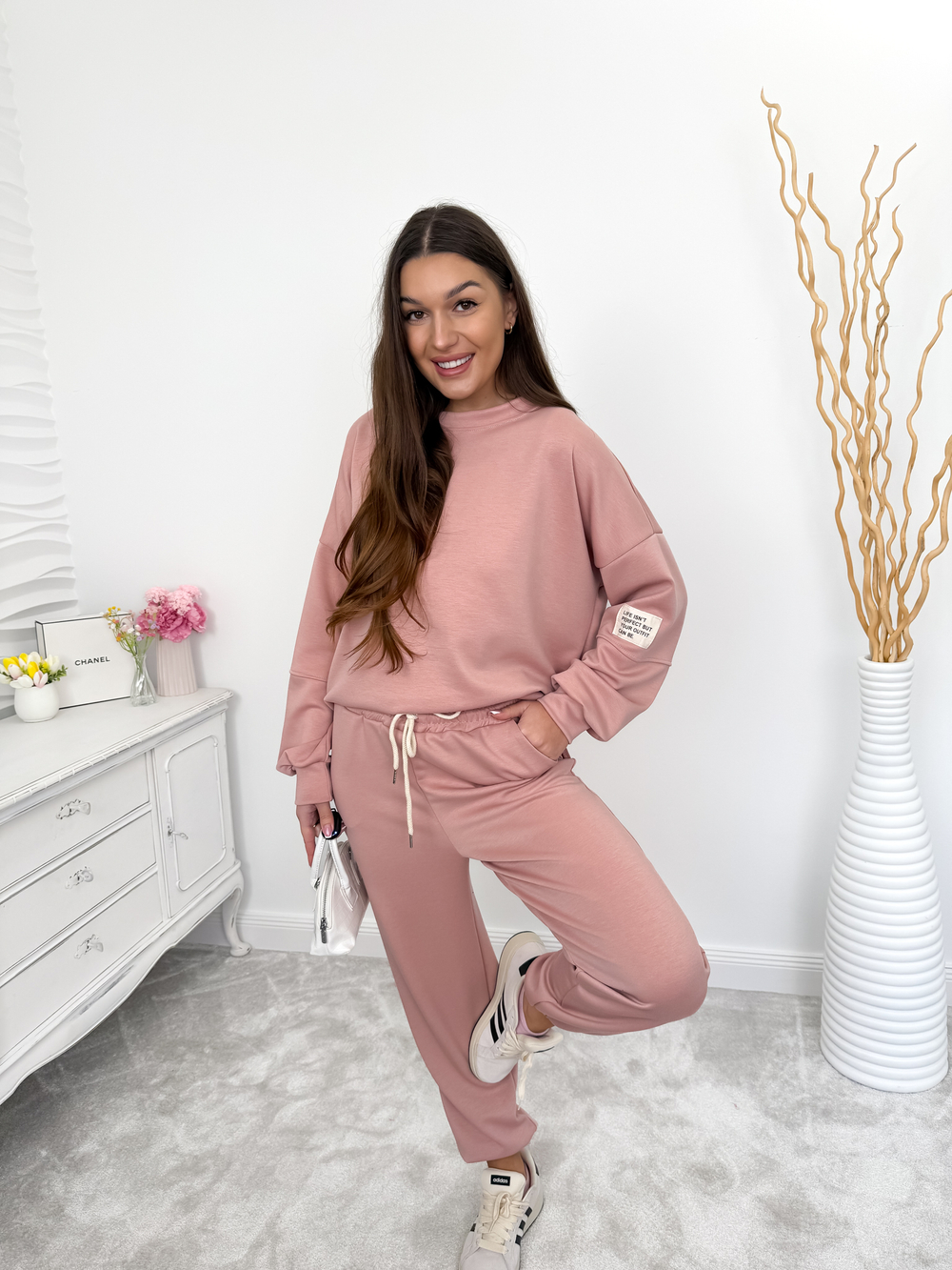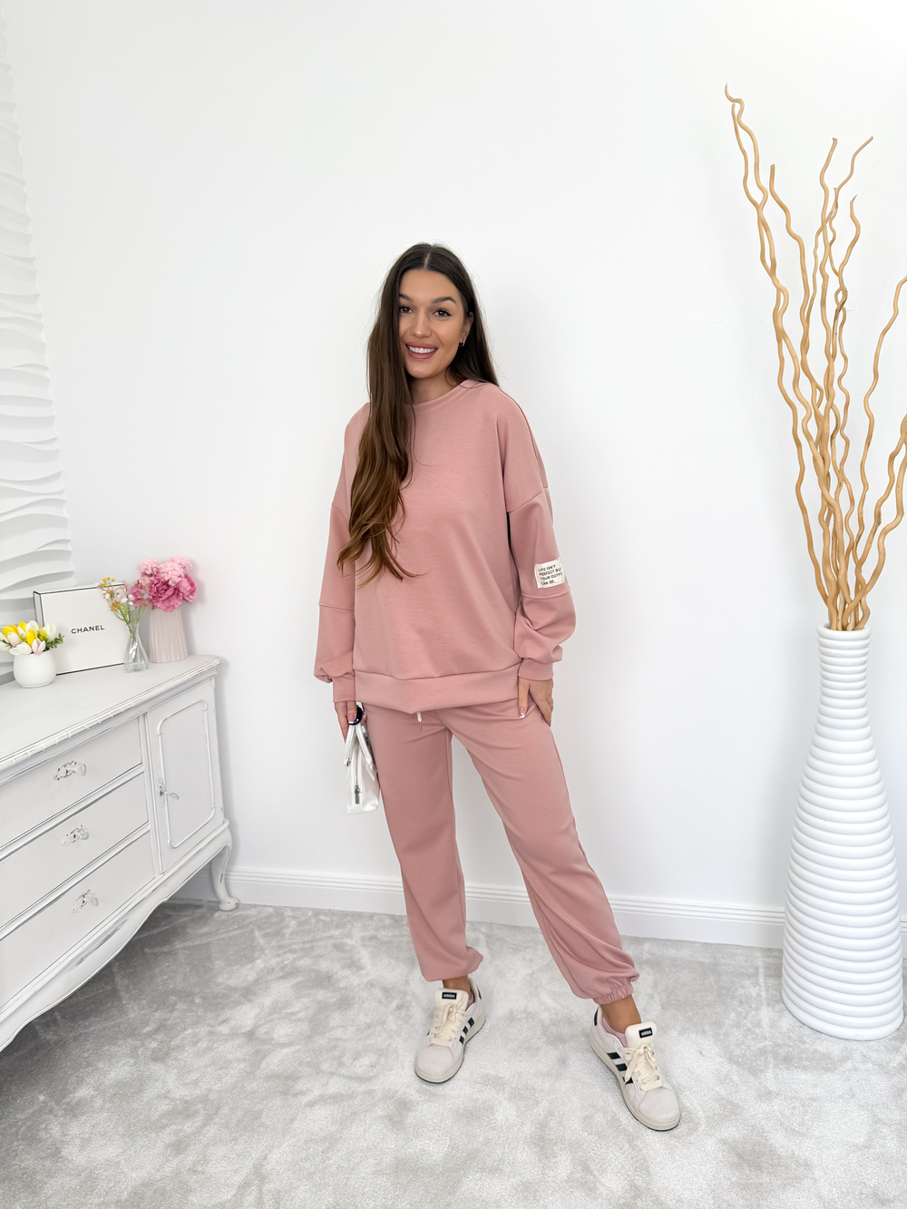 Brudny róż komplet dresowy z białą naszywką na rękawie