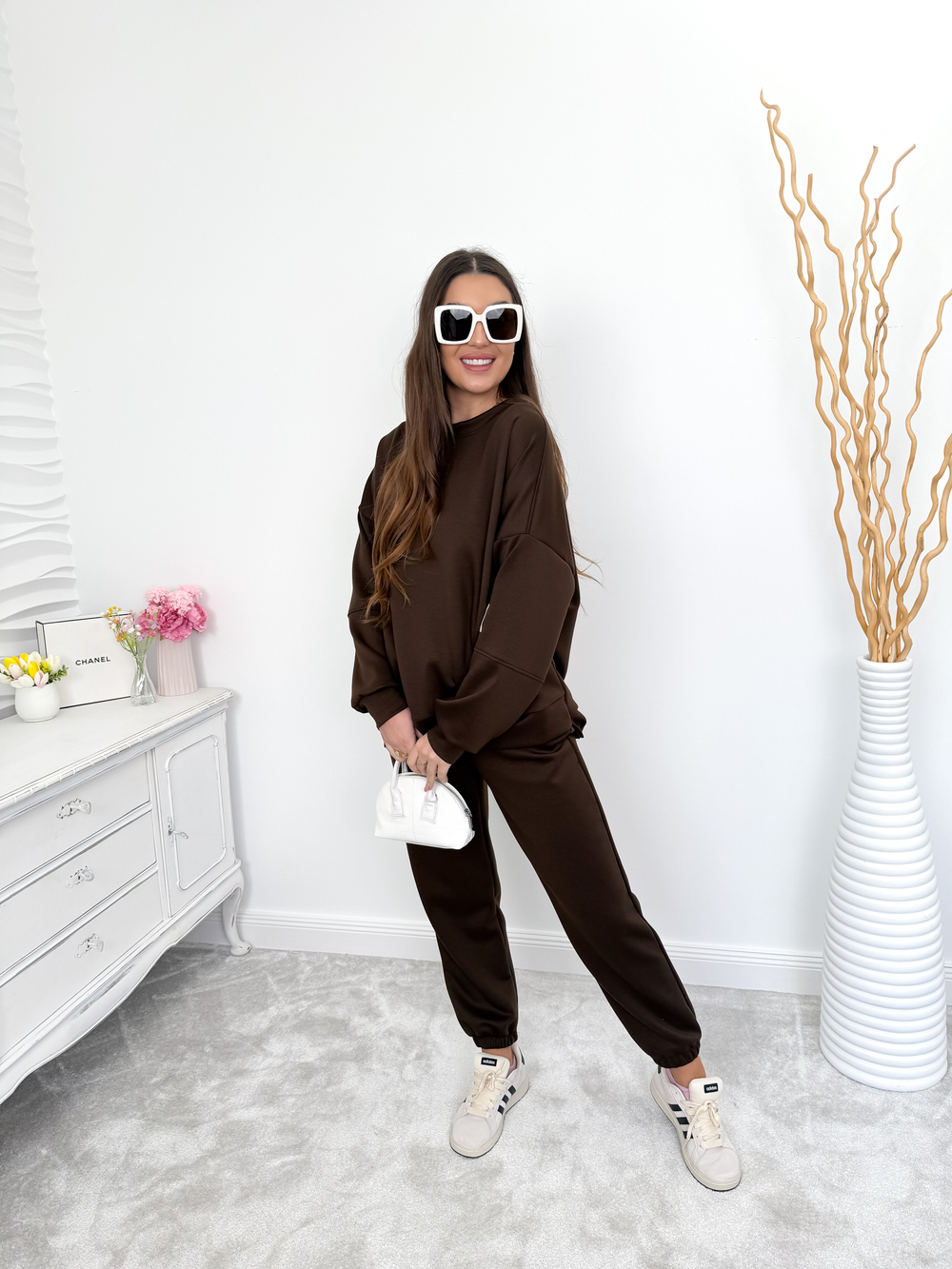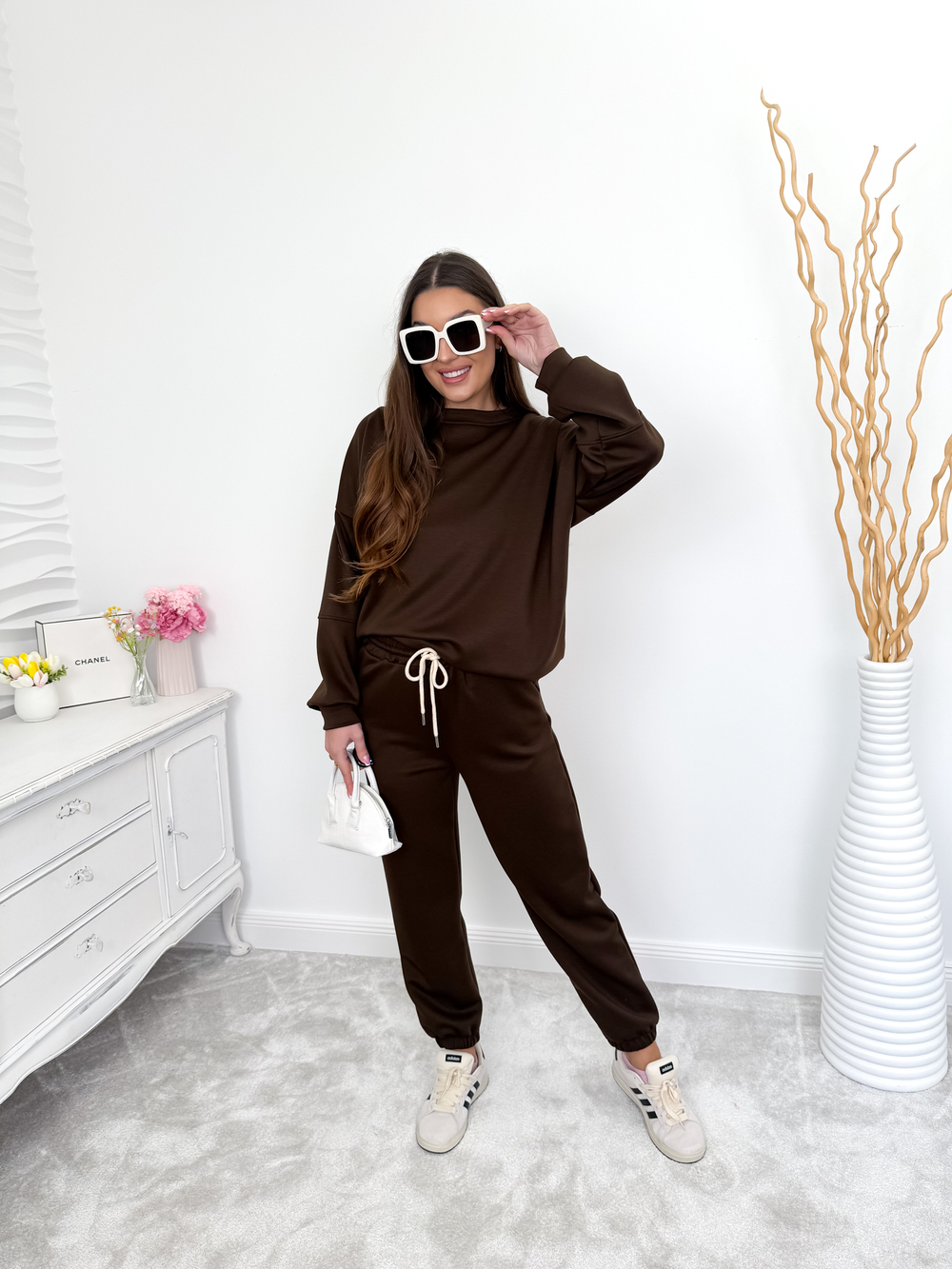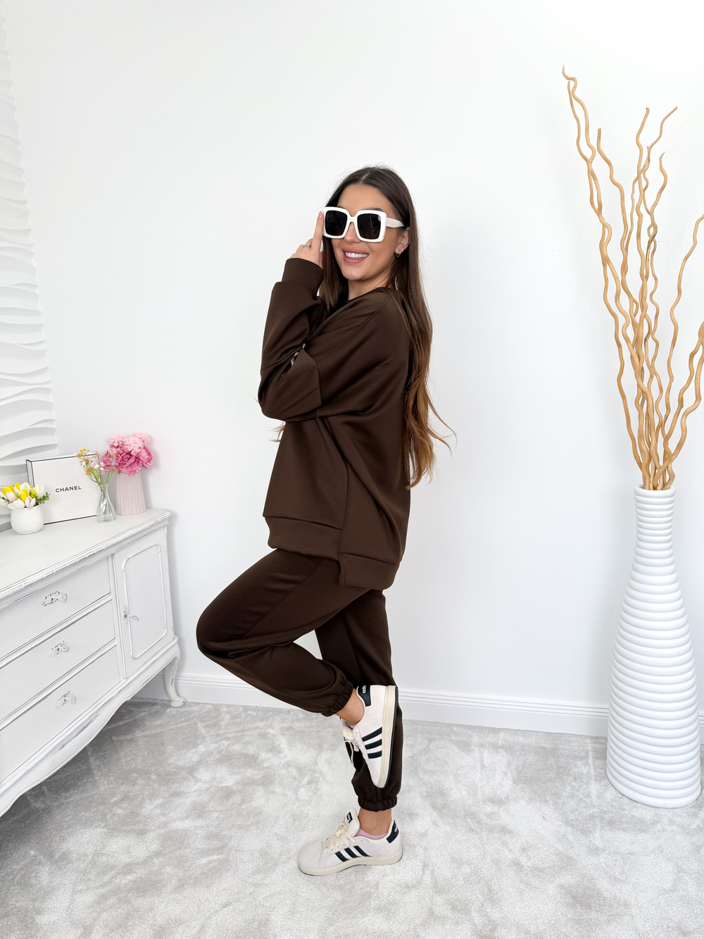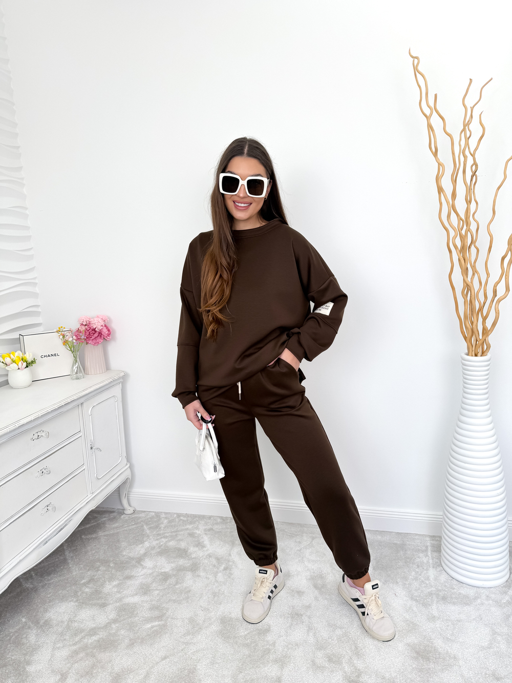 Czekoladowy komplet dresowy z białą naszywką na rękawie