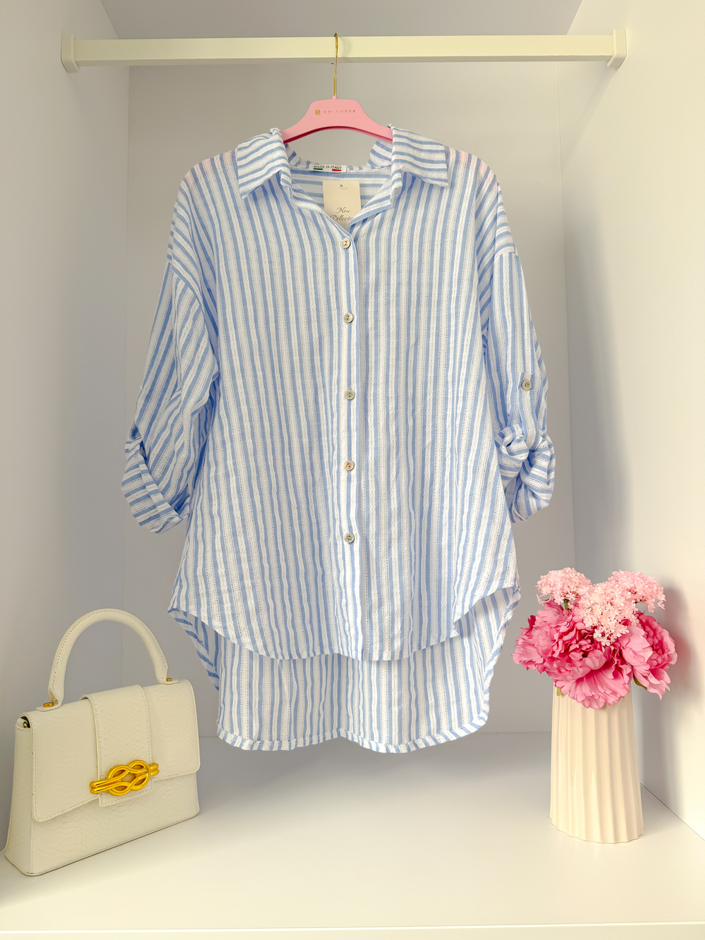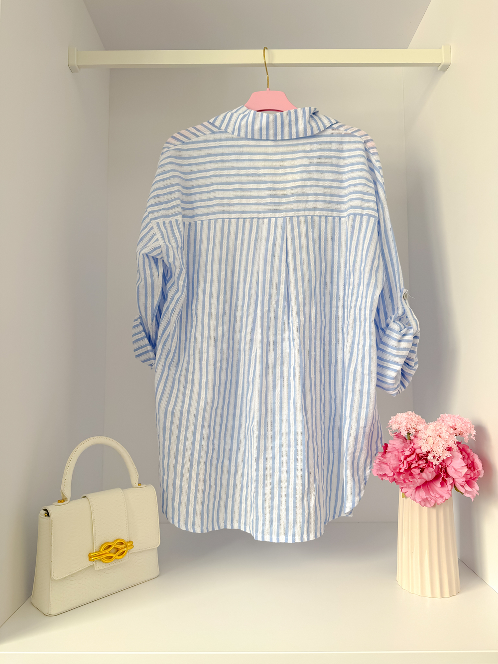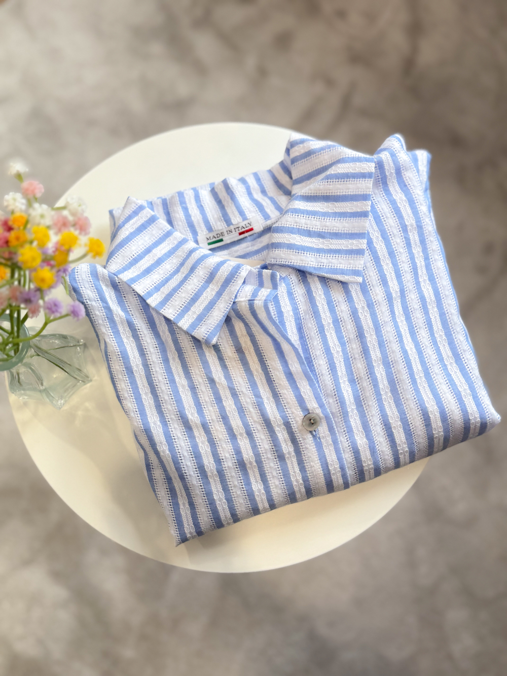 Piękna koszula w paski wykonana z bawełny z delikatnym ażurowym wykończeniem. Posiada rękawy 3/4 z możliwością podpięcia, co dodaje jej funkcjonalności. Włoska produkcja gwarantuje wysoką jakość i ponadczasowy styl.