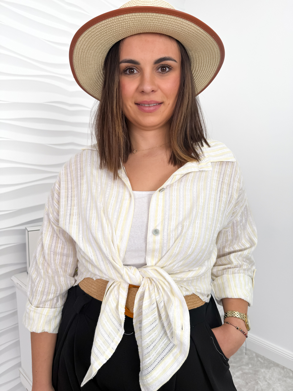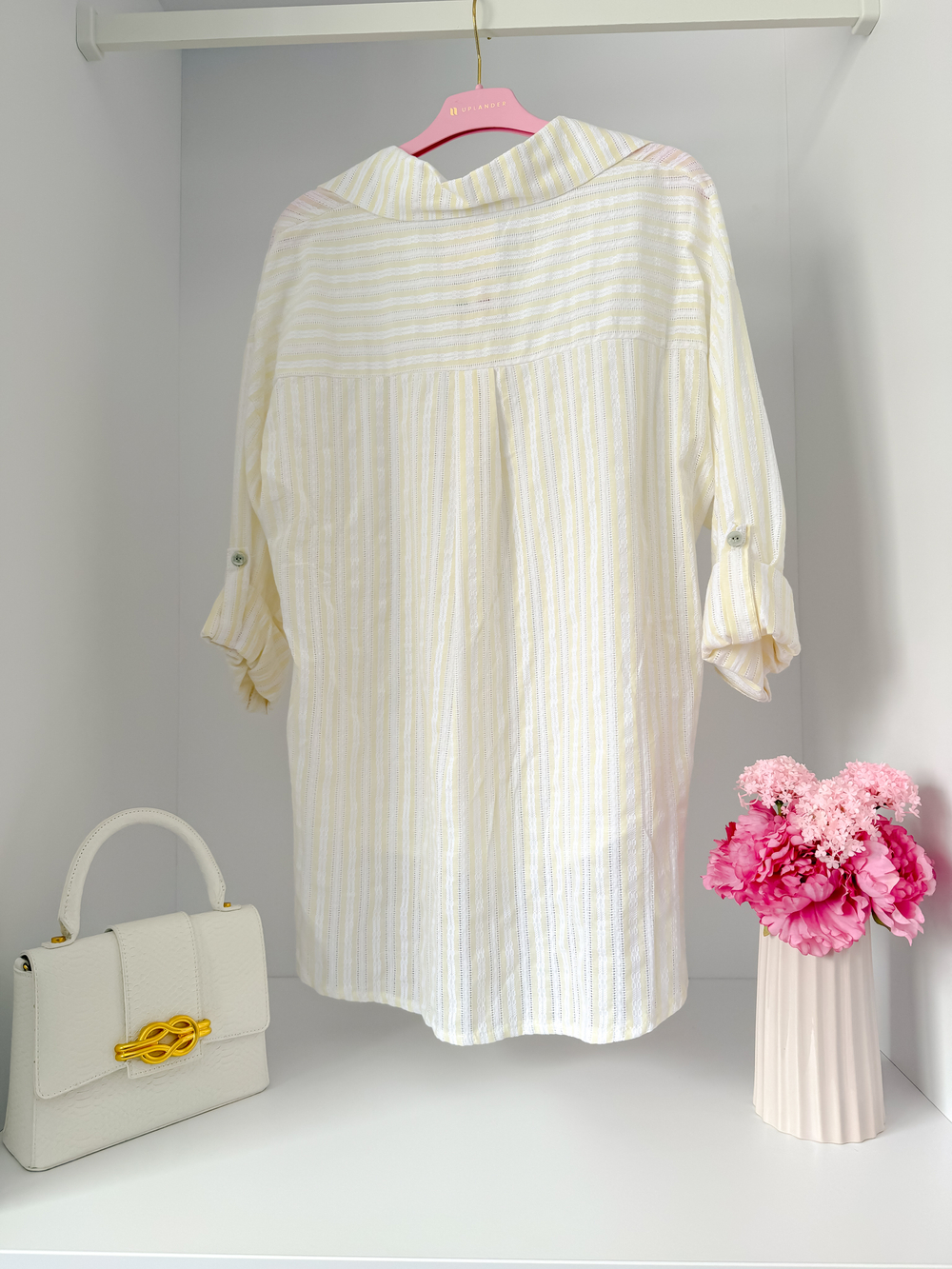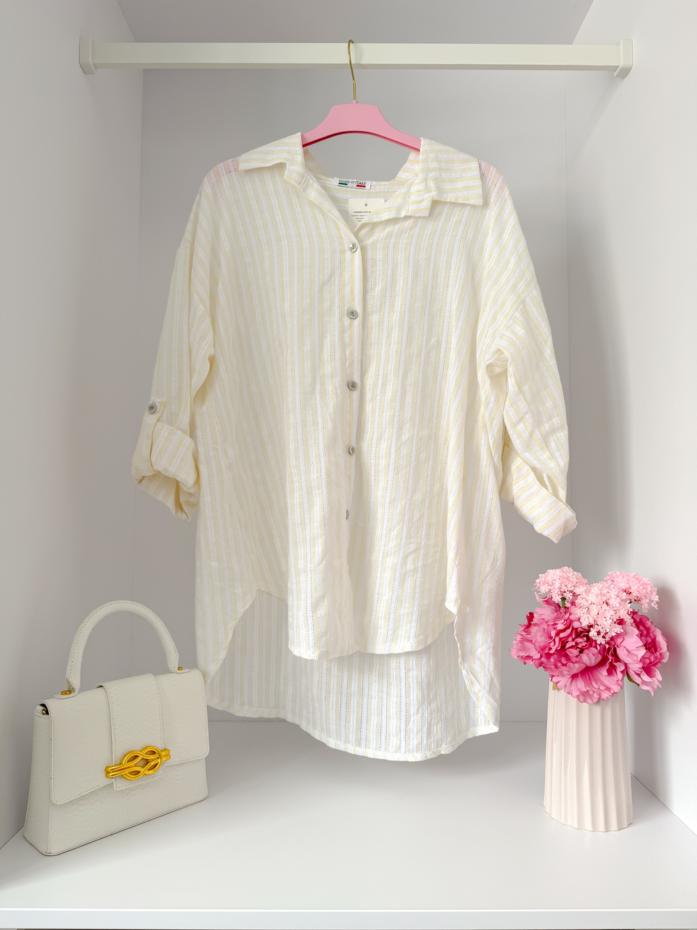 Piękna koszula w paski wykonana z bawełny z delikatnym ażurowym wykończeniem. Posiada rękawy 3/4 z możliwością podpięcia, co dodaje jej funkcjonalności. Włoska produkcja gwarantuje wysoką jakość i ponadczasowy styl.