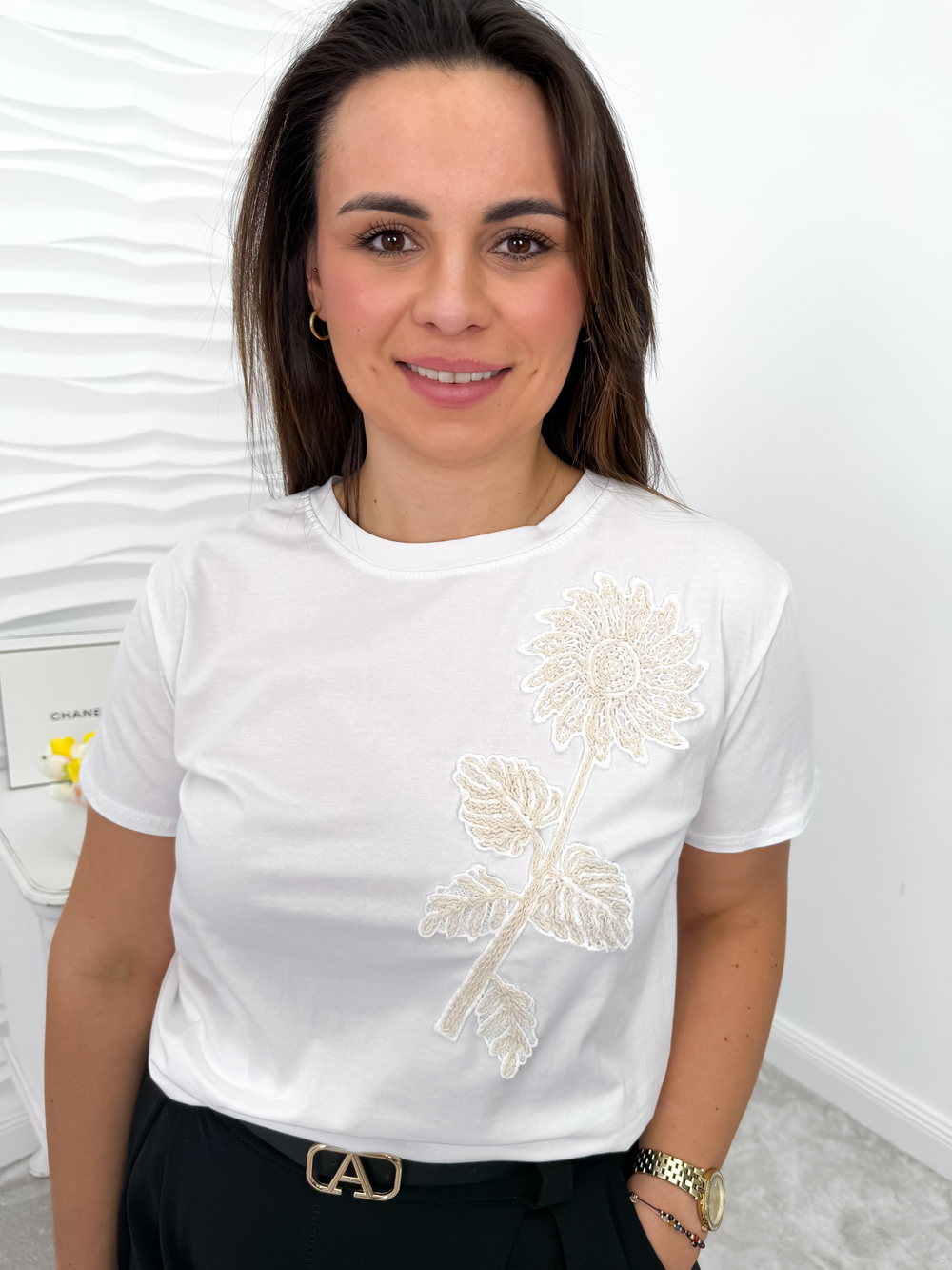 Klasyczny bawełniany T-shirt z piękną aplikacją w formie koronkowego, wyszywanego kwiatka z przodu. Delikatny detal dodaje mu kobiecego uroku i elegancji. Idealny do codziennych stylizacji z nutą subtelności.