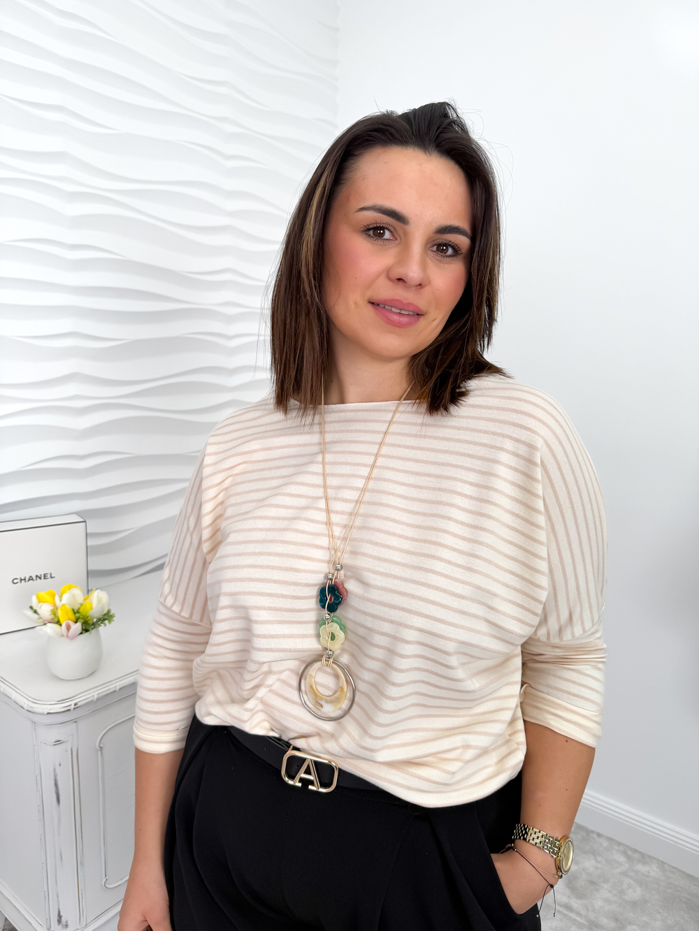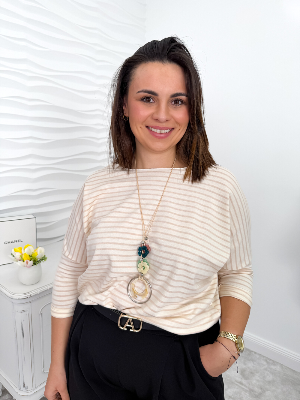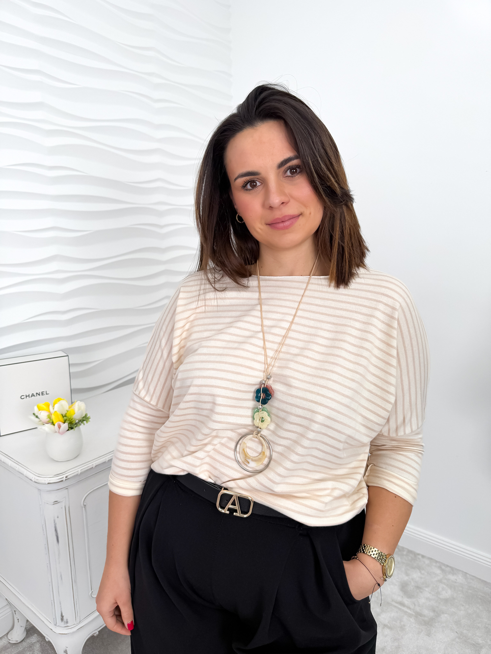 Sweterkowa bluzka w paski o luźnym kroju oversize to wygodna propozycja na co dzień. Model z rękawem 3/4 świetnie układa się na sylwetce i zapewnia swobodę noszenia. Dostępna w kilku wariantach kolorystycznych, idealna do wielu stylizacji.